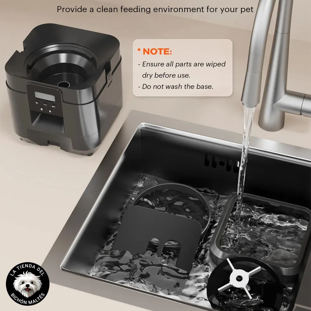 4. Limpieza Regular: Desmonta los tarros y cuencos del comedero para limpiarlos regularmente. Estos componentes son aptos para ser sumergidos en agua, lo que facilita mucho su limpieza. Mantener el comedero limpio es esencial para la salud de tu mascota.