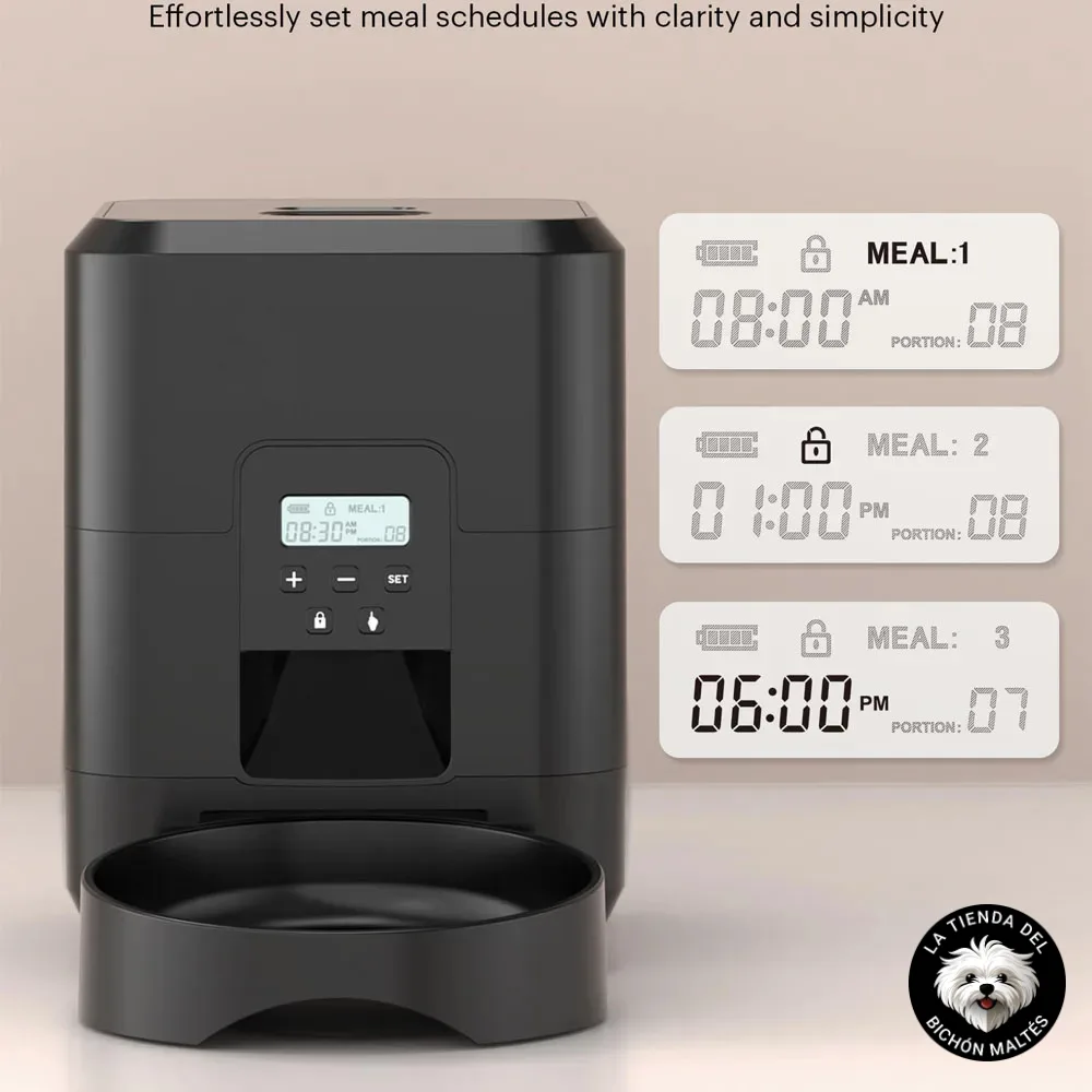 2. Programación de Comidas: Usa la pantalla LCD intuitiva para programar las comidas de tu mascota. Puedes configurar hasta 4 comidas al día, ajustando las porciones de 0 a 40 según las necesidades de tu Bichón Maltés.